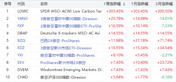 区域ETF方面,由于港股回调,3倍做空富时中国50指数本周领跑,周涨幅达到25.78%。