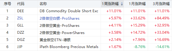 商品ETF方面,本周涨幅居前的多为做空白银、黄金类ETF。