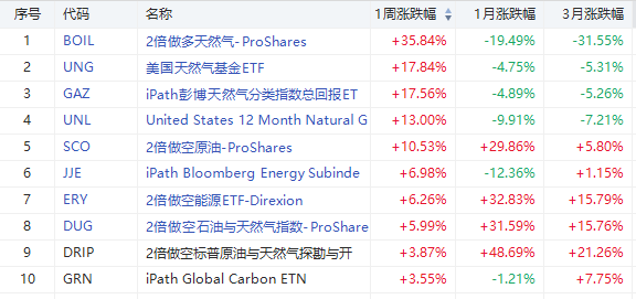 能源ETF方面,本周涨幅第一的仍然是2倍做多天然气-ProShares $BOIL ,一周大涨35.84%。