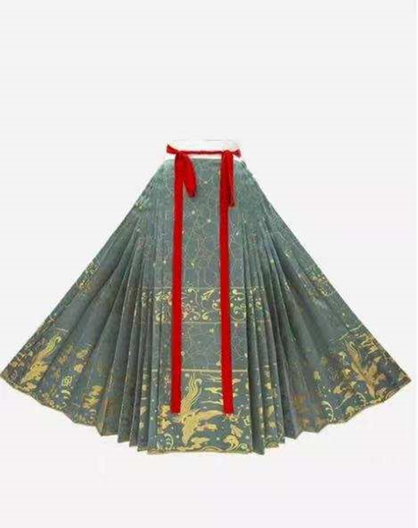 马面裙是中国古代汉族女子主要裙式之一。北京服装学院的曹雪、王群山在论文《从开衩旋裳到罗裾撷芳——马面裙的发展历程》中提到,这种裙子的特点是多幅拼缝,为适应人体腰围而将两侧裙幅打褶。中间裙门重合而形成的光面俗称“马面”。马面裙整体呈梯形,上窄下宽,平铺开来是扇形,两侧褶裥越多,扇形的弧度越大。