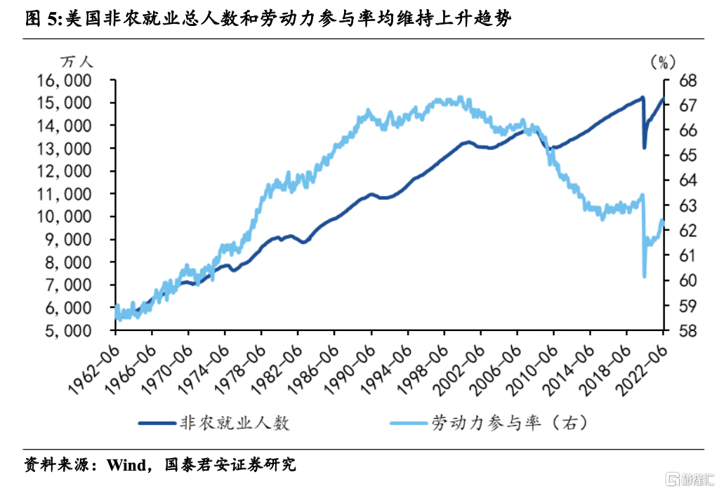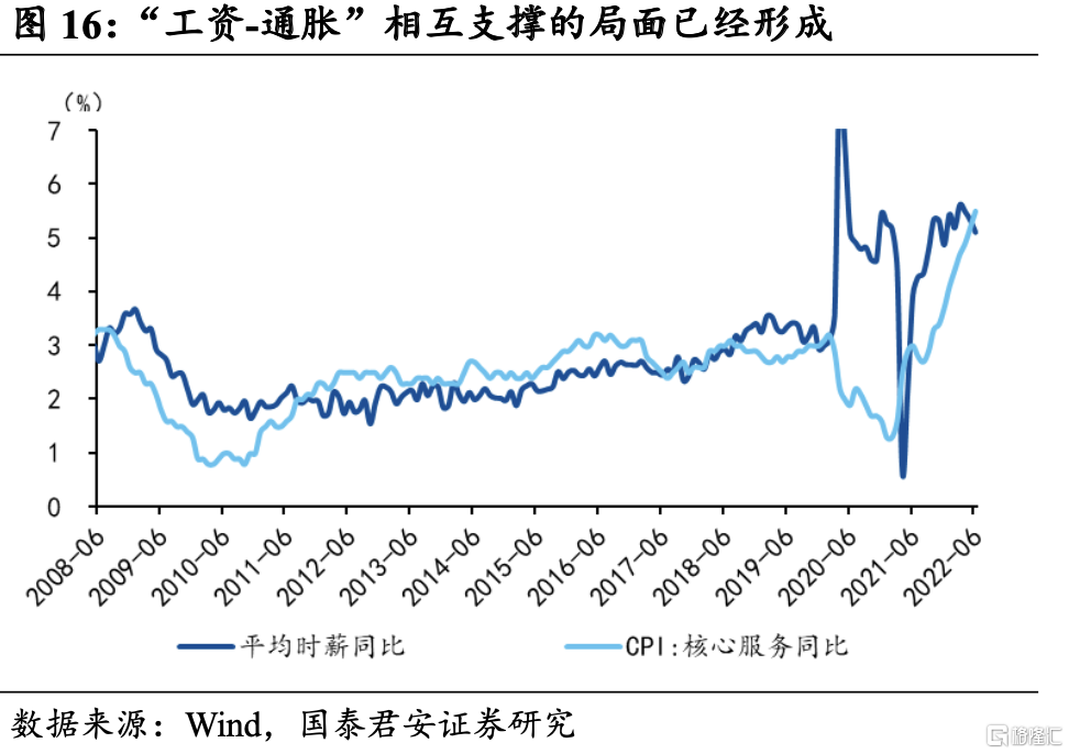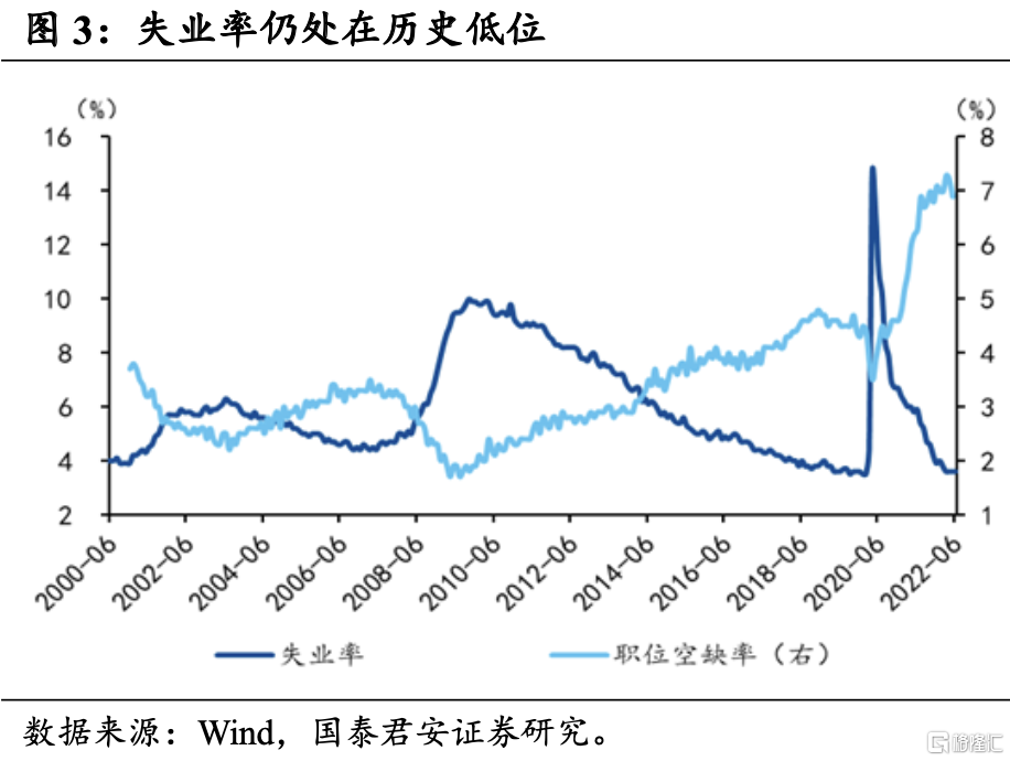 就业指标显示美国当前距离实质性衰退仍有较远距离。截止2022年6月份,美国非农就业总人数已经连续19个月上升,并且目前并没有显示出减少迹象。美国劳动力参与率虽然个别月有所波动,但疫情之后的上升趋势明显。美国失业率已经连续4个月维持在3.6%的历史低位,且疫情之后有明显下降趋势,同时职位空缺率仍维持在6.9%的历史高位,劳动力市场缺口约为530万人。历次经济衰退的失业率平均升幅约为4.1个百分点,失业率高点平均约为8.8%,当前历史低位的失业率和历史高位的职位空缺率,显示短期内失业率很难有大幅上升空间,仍将维持在较低水平。