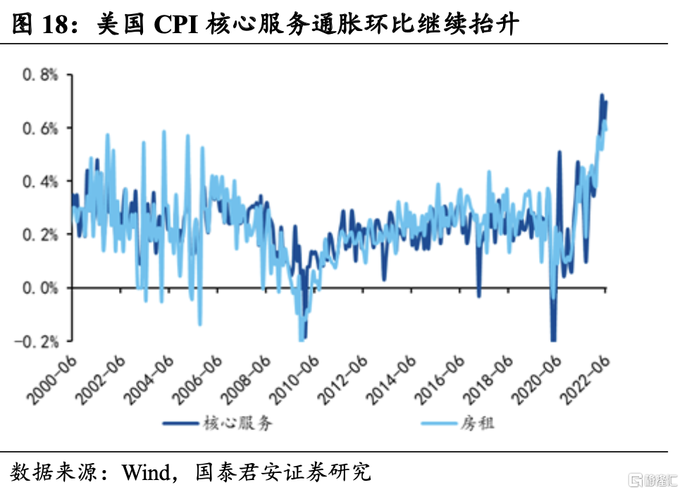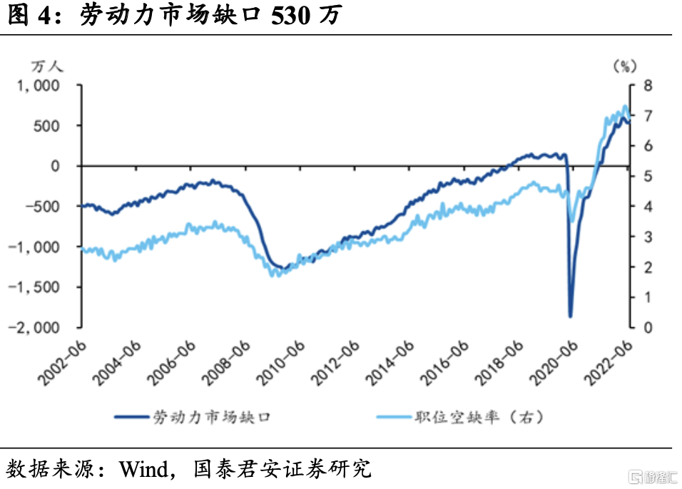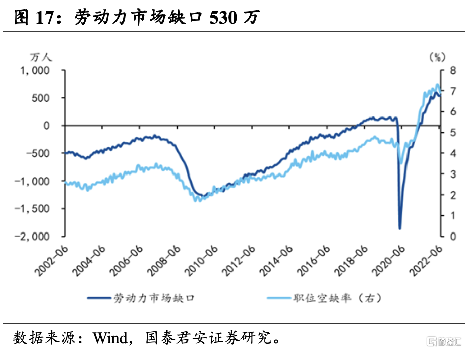 当前美国经济通胀的核心逻辑(倒推):衰退来源于联储——通胀粘性高——服务通胀粘性高——成本端受制于“工资-通胀”支撑,粘性强——530万的劳动力市场缺口。联储加息是美国经济衰退预期的根本来源,而联储加息又锚定通胀,往后看,美国通胀仍将具有较高粘性,缓解速度将会较为缓慢,通胀粘性主要来源于服务通胀的高粘性,从需求端来看,服务消费后续仍有较大修复空间,从供给端来看,劳动力在服务业成本中占比较大,“工资-通胀”相互支撑的局面已经形成,当前美国劳动力市场非常紧俏,失业率处于历史低位,职位空缺率处于历史高位,劳动参与率比疫情前仍低了1.1个百分点,美国当前存在约530万的劳动力缺口,即便劳动参与率恢复到疫情前(贡献约260万劳动力),也仍然存在较大缺口,工资上涨压力仍然较大。