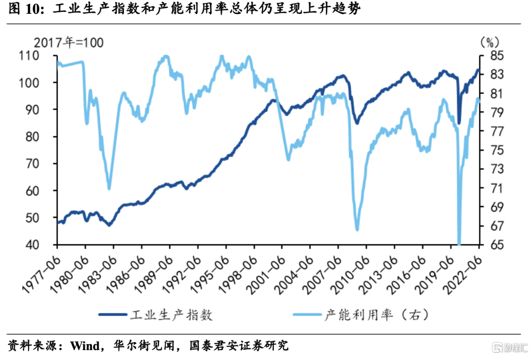 工业生产指数和产能利用率总体仍呈现上升趋势。截止2022年6月份,美国工业生产指数为104.4,产能利用率为80.1%,虽然较5月份小幅下降,但总体仍处在高位,呈现出上升趋势。