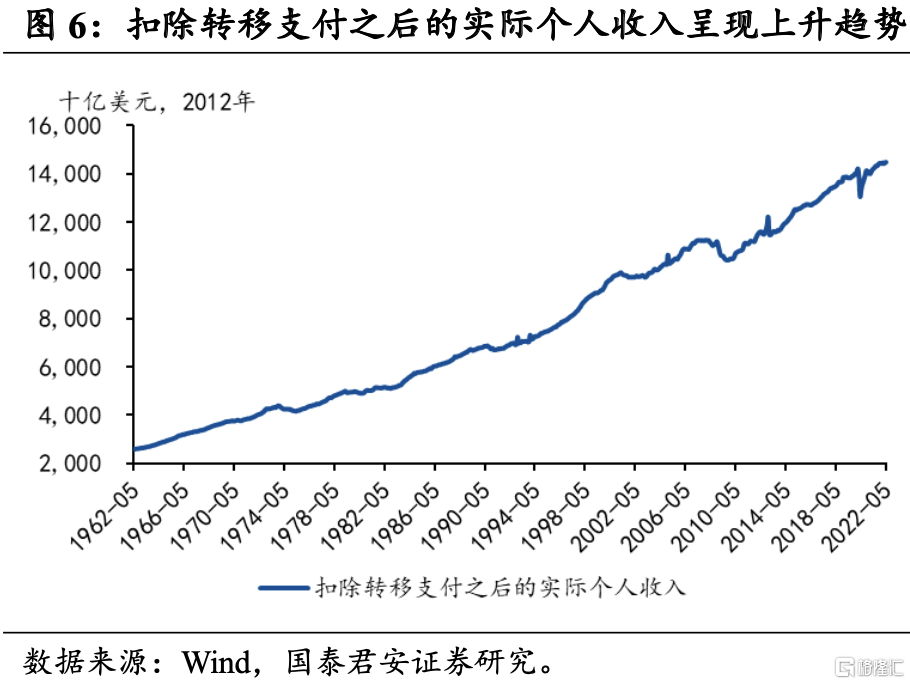 扣除转移支付之后的实际个人收入呈现上升趋势。疫情之后,财政补贴退坡,叠加高通胀,使得居民实际可支配收入呈现下降趋势,但在扣除转移支付收入之后,即便高通胀侵蚀严重,居民实际个人收入总体仍呈现上升趋势,且近两个月仍连续正增长,显示居民收入仍有较强韧性。并且扣除转移支付收入之后的实际个人收入,更能体现出经济的健康或活跃程度,体现出经济的内生动能仍有韧性。