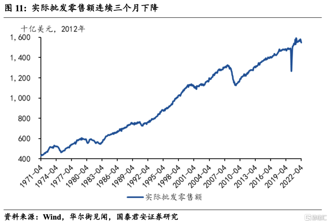 实际批发零售额连续三个月下降,主要由于前期超前消费所致。截止2022年4月,美国实际批发零售额已经连续3个月下降,是NBER关注的指标中唯一呈现下降趋势的经济指标。但该指标主要反映的是商品消费,而美国在疫情期间,商品消费(尤其是耐用消费品)出现了明显超前消费,疫情缓解后,随着消费重心由商品消费转向服务消费,商品消费和其对应的实际批发零售额下降也在预期之内,但之后服务消费复苏将是美国消费和经济的重要动能。