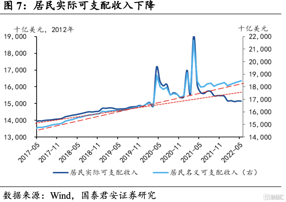 五类指标显示美国经济当前离实质性衰退仍有一定距离,美国年内出现实质性衰退的概率仍然较低,但2023年出现实质性衰退的风险较大。当前美国就业指标、扣除转移支付后的实际个人收入、实际消费支出和工业生产指标均呈现出上升趋势,且短期内并没有显示出有下降迹象,当前只有实际批发零售额呈现下降趋势,但这主要是由于前期商品消费超前导致的,并不能完全说明经济内生动能大幅趋弱,后续服务消费仍是美国消费和经济的重要支撑。