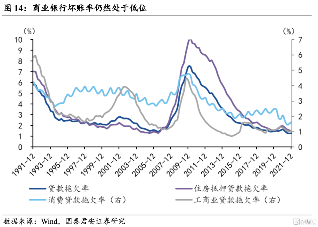 金融部门:商业银行坏账率疫情期间出现下降,截止2021年四季度,坏账率为1.30%,较疫情前下降约0.17个百分点。分项来看,消费贷款、工商业贷款和住房抵押贷款均出现不同程度地下降,总体均处于历史较低水平,金融部门出现系统性或债务风险的概率较低。
