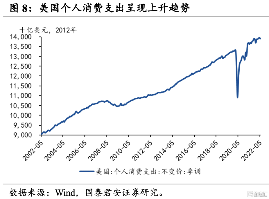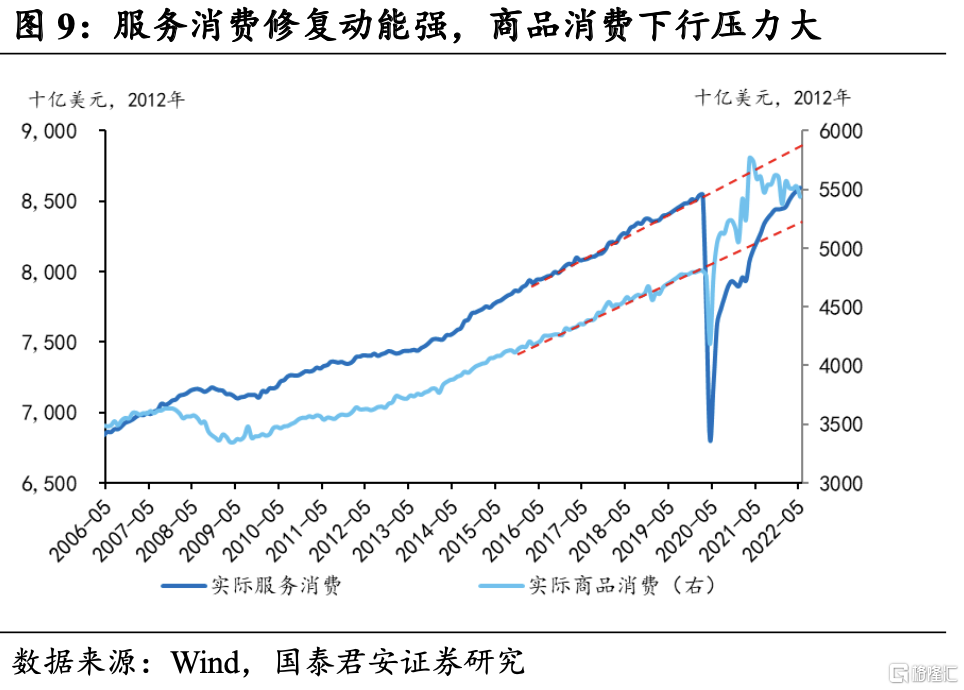 美国实际个人消费支出呈现上升趋势,服务消费是主要支撑因素。疫后在服务消费修复的带动下,美国实际个人消费支出总体呈上升趋势,虽然5月数据有所下滑,但可能与短期波动和季调因素有关,分项来看,商品消费由于前期存在超前消费,后续下行压力较大,是个人消费的主要拖累项,但服务消费目前仍与疫情前趋势值相差甚远,后续仍将继续修复,带动美国整体消费仍呈现出上升趋势。