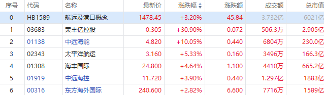 华盛资讯7月18日消息,港股航运股拉升走强,截至发稿,荣丰亿控股涨30.9%,中远海能涨10.05%,报4.82港元每股;太平洋航运涨5%,海丰国际涨4.64%,中远海控涨3.9%,东方海外国际跟涨。