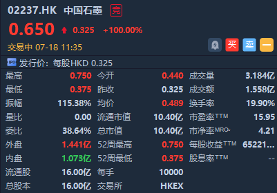 中国石墨(02237.HK)今日正式登陆港交所,上市首日高开35.38%,现报价0.65港元,涨100%,当前成交额超1.5亿港元。