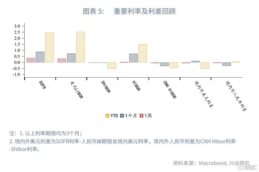 人民币市场方面,本周央行累计进行了150亿元逆回购和1000亿元的MLF,共有150亿元的逆回购和1000亿元的MLF到期,公开市场投放完全对冲到期量。市场利率方面,3个月Shibor下行1.55bp,NCD下行1.55bp,CNH Hibor下行1.45bp。境内外人民币利差(境外-境内)收窄。