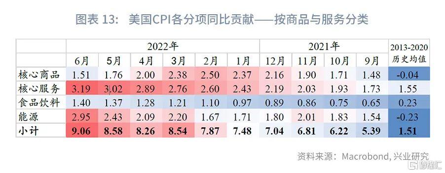 美国6月CPI同比(非季调)达到9.1%,再创40年新高;核心CPI则由于核心商品项下交通类商品供应压力缓解而有所回落,由上个月的6%降至5.9%。根据对CPI下各分项的拆解分析,核心商品CPI同比增速见顶的确定性较高,食品价格上涨压力有望减轻,但能源价格短期仍居高不下。更为重要的是,服务消费接棒商品消费,“薪资-通胀螺旋”的风险有增无减,使得美国通胀正在变得根深蒂固。