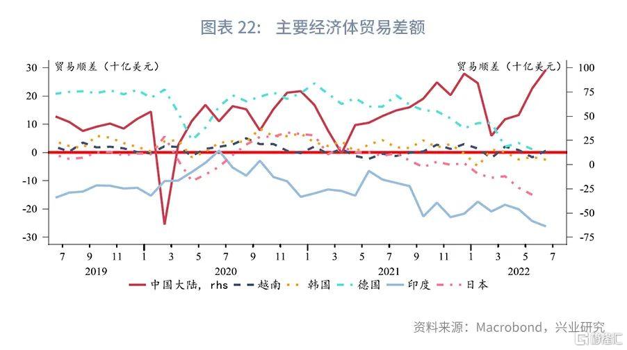 日本、德国、韩国、越南、印度等经济体贸易顺差转逆或是贸易逆差扩大的背景下,我国贸易顺差还在不断扩大,展现出我国贸易的韧性之强。从短期因素来看,6月初上海市取消区域静态管理,进出口贸易恢复,前期滞留订单回补;从长期因素来看,我国是全球唯一全产业链出口的经济体,随着全球需求的涨落,出口呈现“东方(西方)不亮西方(东方)亮”特征,详细分析请见《兴业研究宏观报告:顺差“新高”的背后——评2022年6月进出口数据20220714》。