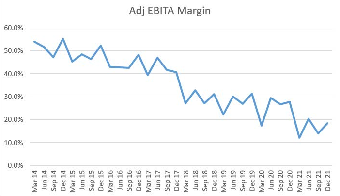 而以上这些原因,导致了阿里的EBITA利润率从之前保持了较长时间的27%的水平下降至最近几个季度平均16%的水平。