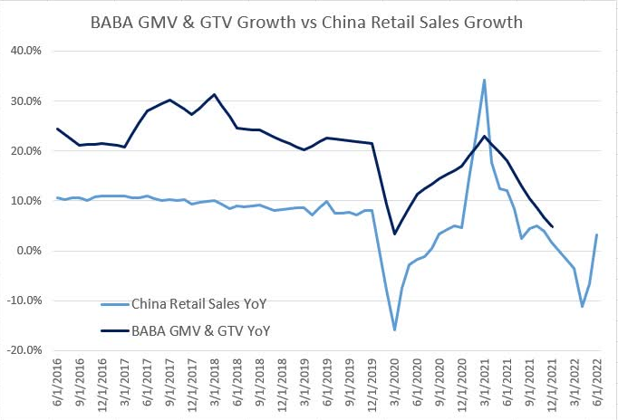 而由于阿里巴巴覆盖了9.5亿的活跃用户,占据了全国14亿人的三分之二,因此公司的增长不可避免地受宏观经济形势影响。中国2022年地GDP增长目标是5.5%,上半年因为疫情影响较大,录得2.5%的增长。