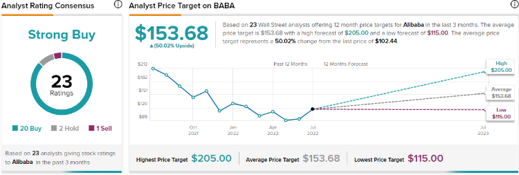 根据Tipranks的统计,过去三个月,有23位分析师对阿里巴巴进行了评级,其中20位给予“买入”评级,2位给予“持有”评级,1位给予“卖出”评级,未来12个月平均目标价是153.68美元,较当前股价拥有约50%的上升空间。