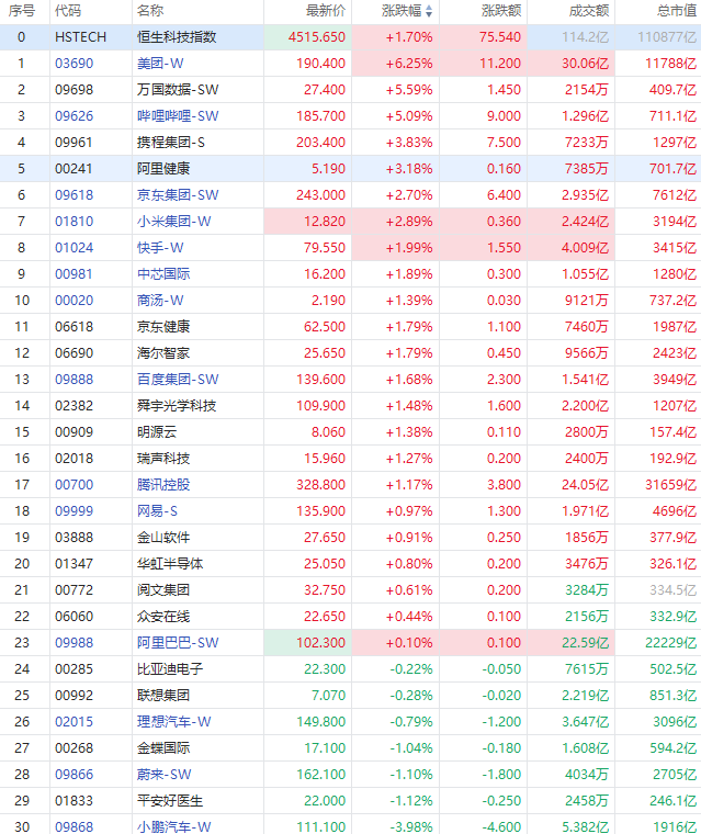 美团涨6.25%,科网股多数上行,哔哩哔哩涨5%、万国数据涨超4%,携程涨超3%,小米、阿里健康涨超2%,商汤、京东涨近2%,腾讯涨1.17%,阿里巴巴微涨。