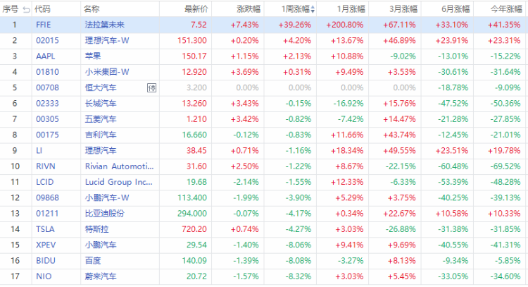 截至发稿的近一周以来,新能源造车企业股价多数走弱 。法拉第未来近一周录得涨逾39%的表现。其他成分股中,蔚来汽车、百度、小鹏汽车跌逾8%,特斯拉、比亚迪跌逾4%。