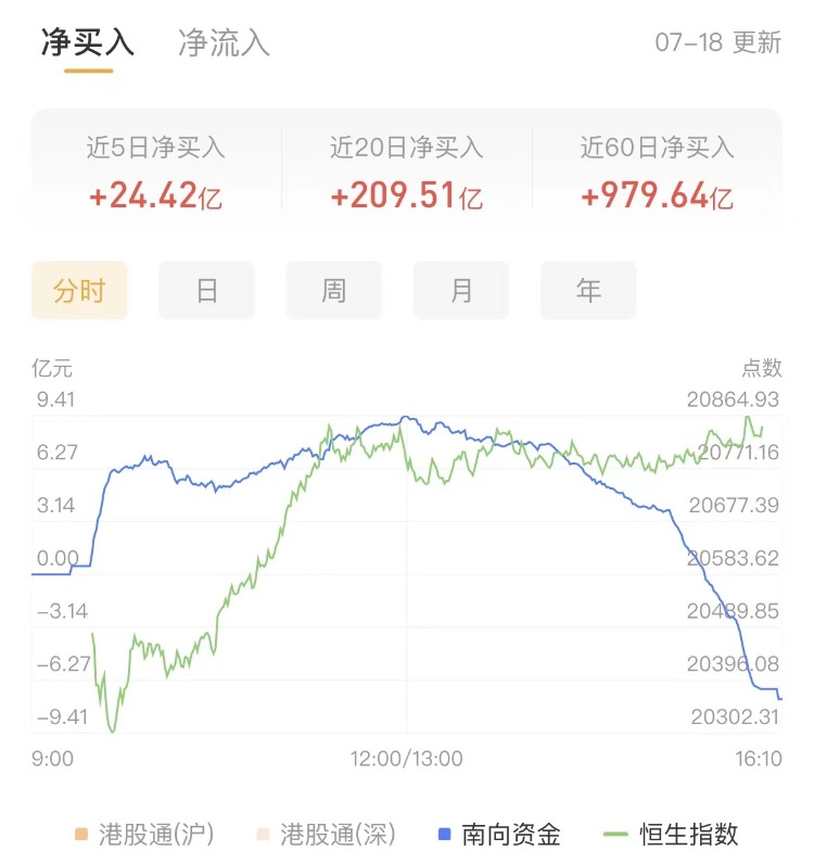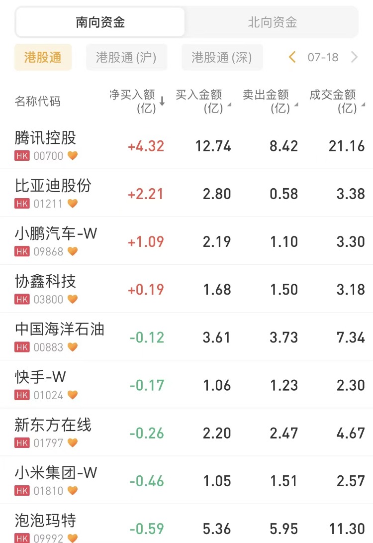 南下资金净买入腾讯4.32亿港元,为今日买入之最。此外,南下资金净买入比亚迪股份2.21亿港元,净买入小鹏汽车1.09亿港元。