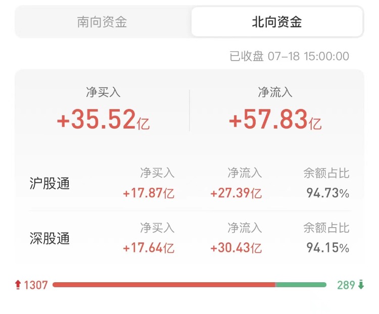 北上资金今日净买入35.52亿元,沪股通净买入17.87亿元,深股通净买入17.64亿元。上一交易日净卖出89.31亿元。