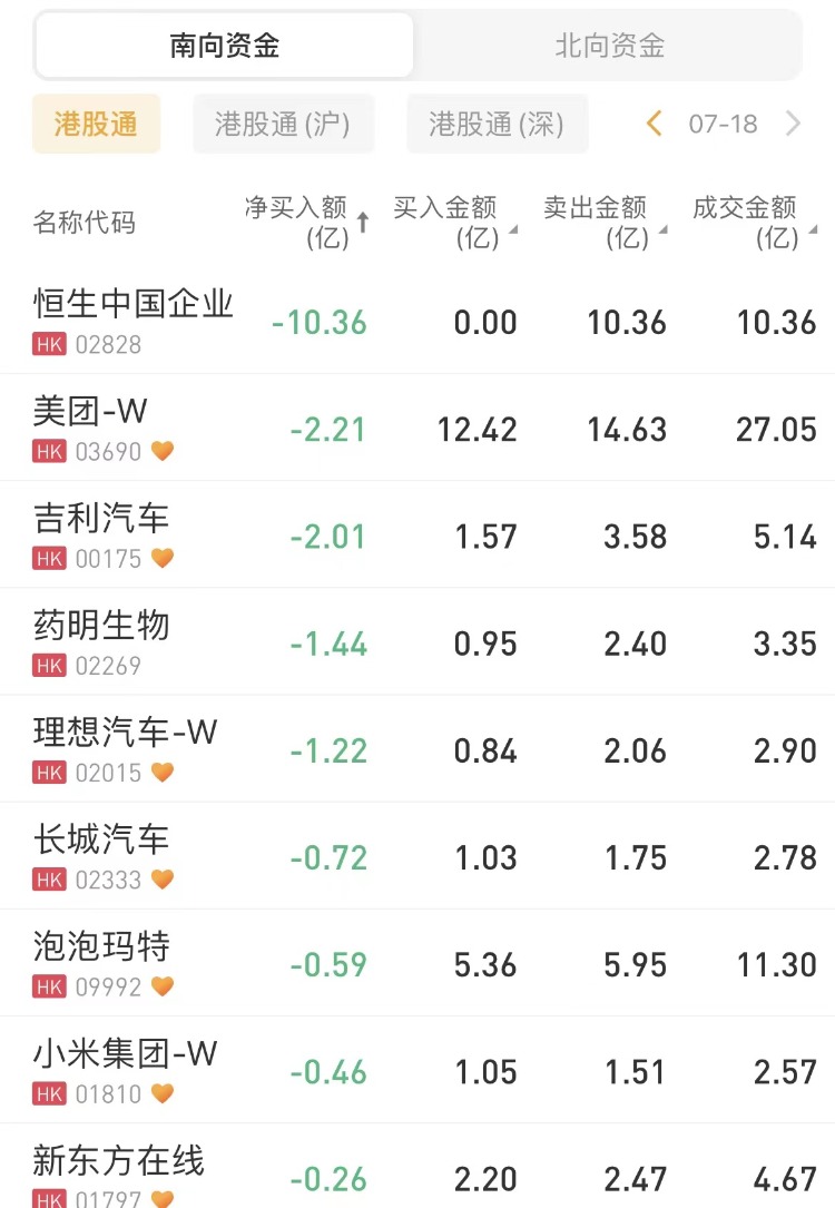 南下资金净卖出恒生中国企业10.36亿港元,为今日卖出之最,净卖出美团2.21亿港元。