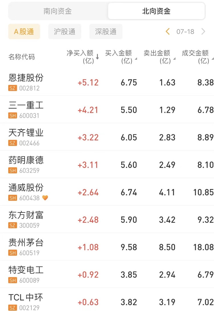 北上资金今日净买入恩捷股份5.12亿元,为今日买入之最;净买入三一重工4.21亿元。
