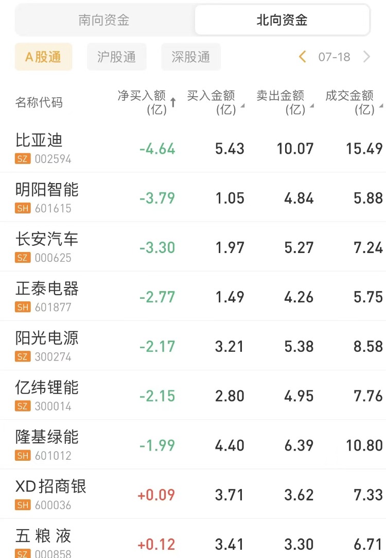 今日北上资金净卖出比亚迪4.64亿元,明阳智能遭净卖出3.79亿元。