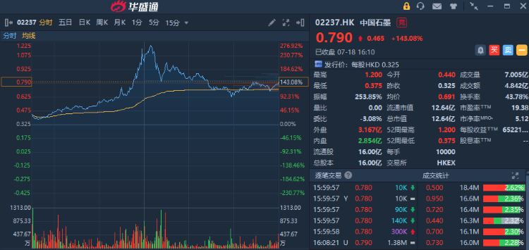 华盛资讯7月18日讯,石墨矿开采商中国石墨 $02237.HK 首挂高开35.38%,盘中走高一度涨超260%,尾盘收涨143.08%,一手账面浮盈4650港元,全日成交额4.84亿港元,最新总市值12.64亿港元.