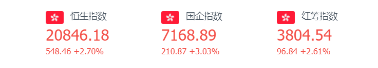 港股恒指周一涨2.7%,报20846.18点;国企指数涨3.03%,报7168.89;恒生科技指数大涨3.02%,报20846.18,成分股万国数据涨近7%,哔哩哔哩涨超6%,美团股价大涨近6%。