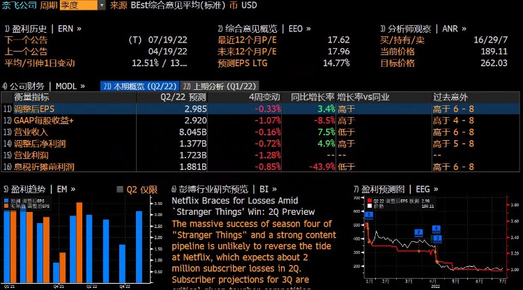 摩根士丹利分析师Benjamin Swinburne将对奈飞的目标价从300美元下调至220美元,并在该公司发布季度报告前维持对该股的持股观望评级。他认为,不断增加的宏观不利因素促使消费者缩减在流媒体方面支出,因此对奈飞净增量和利润率的共识预期可能存在风险。该分析师补充说,预计流失率上升和美元走强将对奈飞下半年的业绩产生影响。