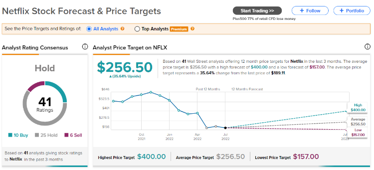 据TipRanks评级网站,当前华尔街共有41位分析师的评级覆盖奈飞,其中包括10个“买入”评级,25个“持有”评级,6个“卖出”评级。分析师对该股的平均目标价为256.5美元,较其最新股价有35.64%的潜在上涨空间。