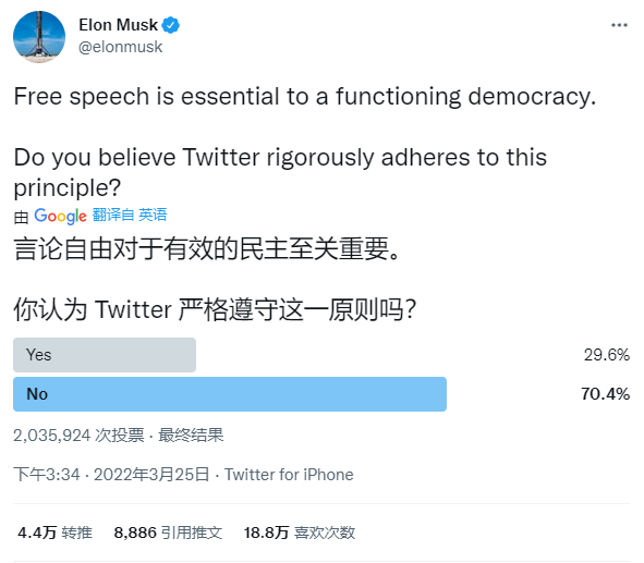 3月25日,马斯克又接着发起了一项投票,问大家推特有没有言论自由。这项投票共有两百多万人参与,近七成参与者选择了否。马斯克进而认为推特的行为破坏了民主,觉得人们或许需要一个新的平台。