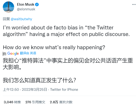第一炮打向了推特的算法,他觉得推特算法的偏向性会对公众带来难以估量的影响。
