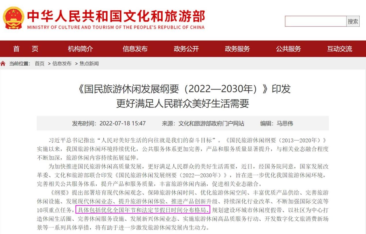 近日,经国务院同意,国家发展改革委、文化和旅游部联合印发《国民旅游休闲发展纲要(2022—2030年)》。《纲要》提出10项重点任务,具体包括优化全国年节和法定节假日时间分布格局等。