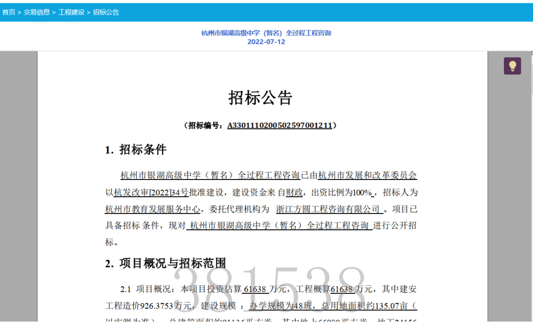杭州市银湖高级中学(暂名)项目位于富阳区高教园区内,浙江建设技师学院西南侧对面,北临百川街。项目投资估算61638万元,工程概算61638 万元,其中建安工程造价926.3753万元。