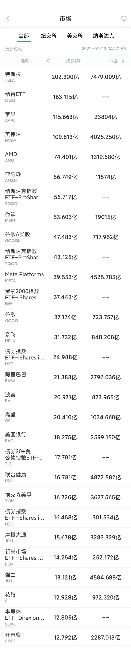 以下为美股当日交易最活跃的20只股票(按成交额):