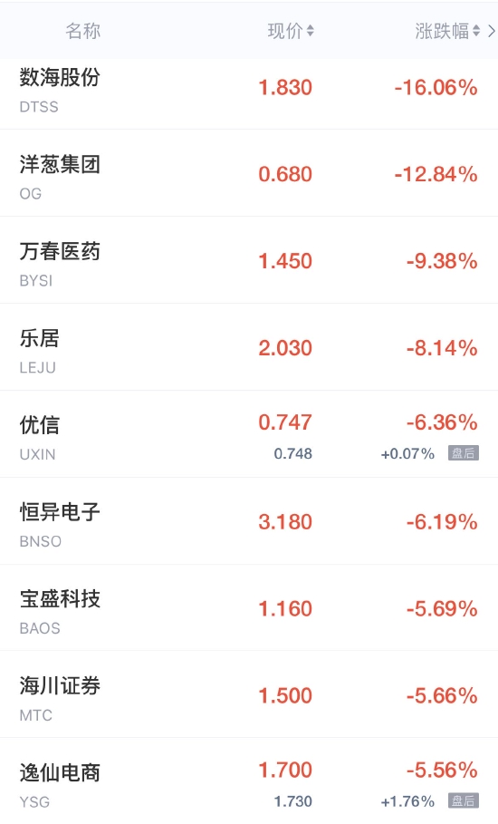 领跌中概股列表: