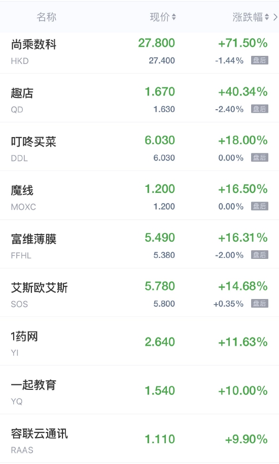 领涨中概股列表: