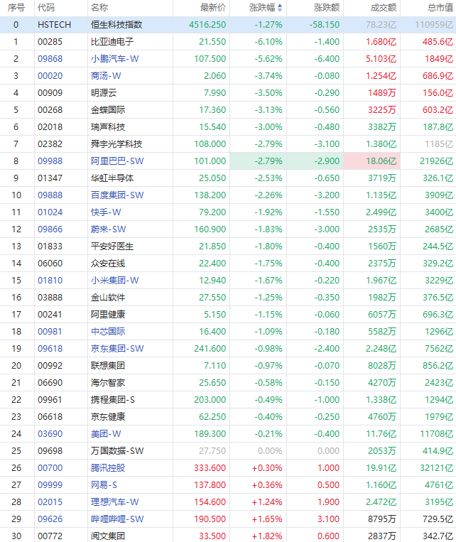 比亚迪电子跌超6%领跌成分股,商汤-W、明源云跌近4%;科网股也多数走弱,阿里巴巴-SW跌近3%,快手-W、百度跌超2%,腾讯控股、哔哩哔哩逆势走高。