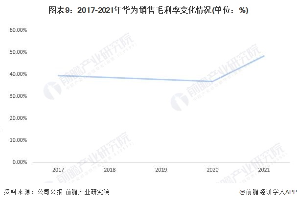 从毛利率来看,2017-2021年,华为的销售毛利率呈波动递增趋势变化。2021年,华为销售毛利率为48.3%,较2020年增长11.6个百分点。