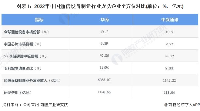 目前,中国通信设备制造行业的龙头企业是华为和中兴通讯。其中,在通信设备制造行业的几大关键指标对比下,华为在全球通信设备市场份额、5G基站建设中标份额、通信设备制造业务营业收入和研发费用方面,占用绝对优势;华为是目前国内通信设备市场份额最高、5G基站建设能力最强、通信设备制造业务规模最大的龙头企业。