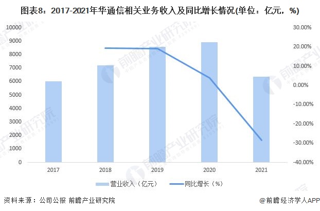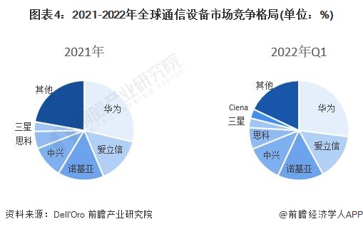 根据Dell'Oro集团的数据,按销售额计算,2021年华为占全球通信设备市场28.7%的份额,同比增长7%。爱立信以15%位居第二,其次是诺基亚(14.9%)、中兴(10.5%)、思科(5.6%)和三星电子(3.1%)。在不包括中国的全球市场,华为的份额为18%,爱立信和诺基亚的份额分别为20%。截至2022年一季度末,华为依然以超四分之一的市场份额远远领先其他通信设备行业的竞争者。