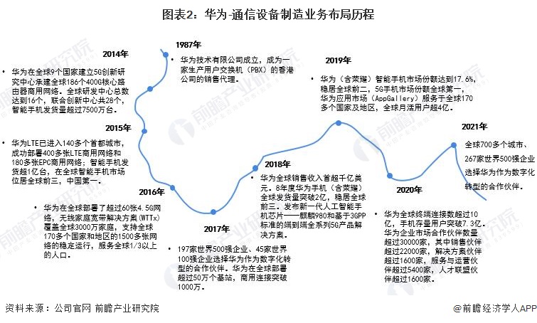 1987年,华为技术有限公司成立,成为一家生产用户交换机(PBX)的香港公司的销售代理。2014年,华为在全球9个国家建立5G创新研究中心承建全球186个400G核心路由器商用网络。全球研发中心总数达到16个,联合创新中心共28个,智能手机发货量超过7500万台。2018年华为全球销售收入首超千亿美元。8年度华为手机(含荣耀)全球发货量突破2亿,稳居全球前三。发布新一代人工智能手机芯片——麒麟980和基于3GPP 标准的端到端全系列5G产品解决方案。2020年,华为全球终端连接数超过10亿,手机存量用户突破7.3亿。华为企业市场合作伙伴数量超过30000家,其中销售伙伴超过22000家,解决方案伙伴超过1600家,服务与运营伙伴超过5400家,人才联盟伙伴超过1600家。2021年,全球700多个城市、267家世界500强企业选择华为作为数字化转型的合作伙伴。