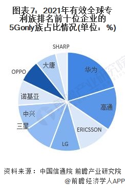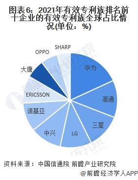 中国信通院数据显示,在ETSI进行5G专利声明的产业主体中,排名前十的企业有效专利族数量超过全部专利族数量的70%。其中,华为以14%的有效专利族占比量排名全球第一,高通、三星和LG分别以9.8%、9.1%和8.3%的占比量排名全球第二至第四位,中兴以8.3%的占比量排名全球第五。