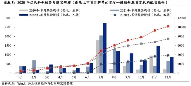 兴业证券研报进一步指出,剔除上市首日即解禁的首发一般股份及首发机构配售股份,今年科创板解禁规模为10166亿元,相较于2021年的7459亿元和2020年的3835亿元显著增加。其中,今年7月科创板解禁规模2733亿元,为过去三年单月解禁规模峰值。