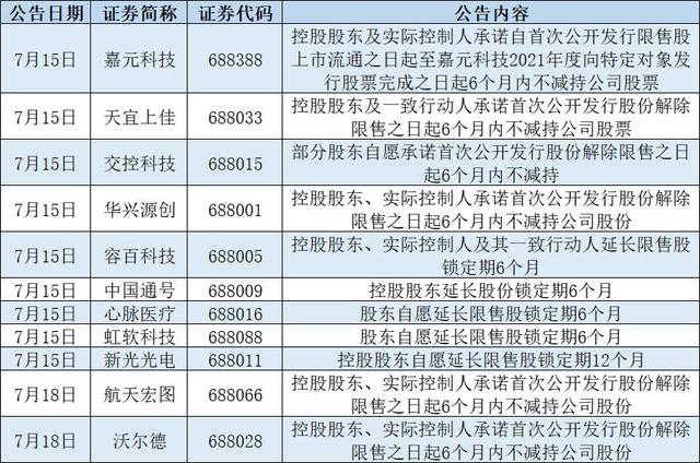 无独有偶,7月15日晚,苏州华兴源创科技股份有限公司(简称“华兴源创”,688001)等9家科创板首批上市公司也发布了控股股东、实控人、部分股东自愿延期解禁或者承诺不减持的公告。