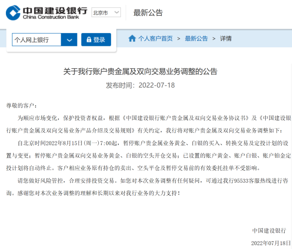 在公告中,建设银行表示,将自北京时间2022年8月15日(周一)7:00起,暂停账户贵金属业务黄金、白银的买入、转换交易及定投计划的设置与变更;暂停账户贵金属双向交易业务黄金、白银的空头开仓交易;已设置的账户黄金、账户白银、账户铂金定投计划将自动终止。