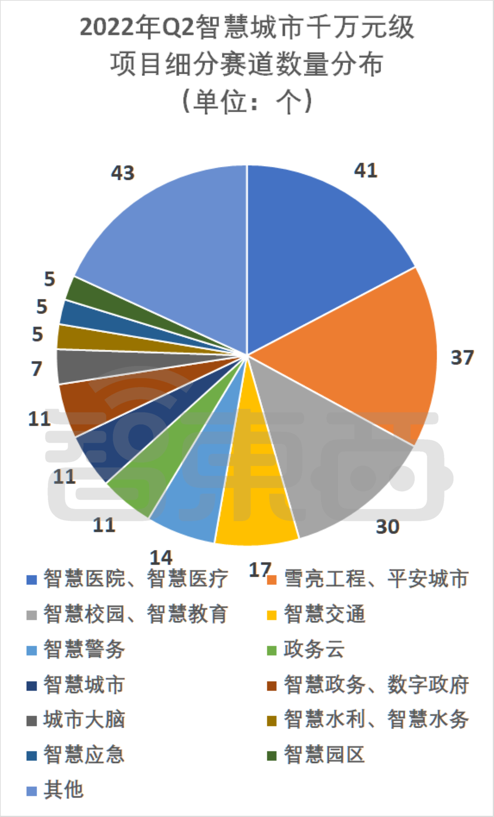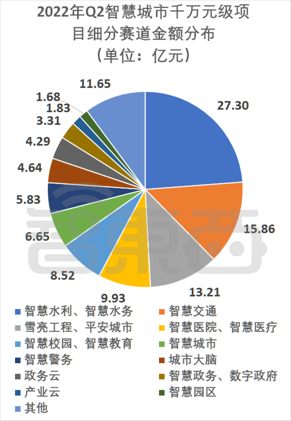 第二季度的亿元级智慧城市项目中,智慧类项目的细分领域分布比较分散,既有智慧水利、智慧交通类项目,也有智慧政务、智慧警务、智慧教育、智慧医疗类项目。
