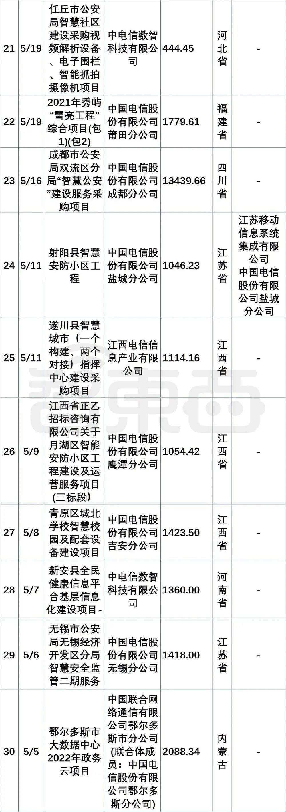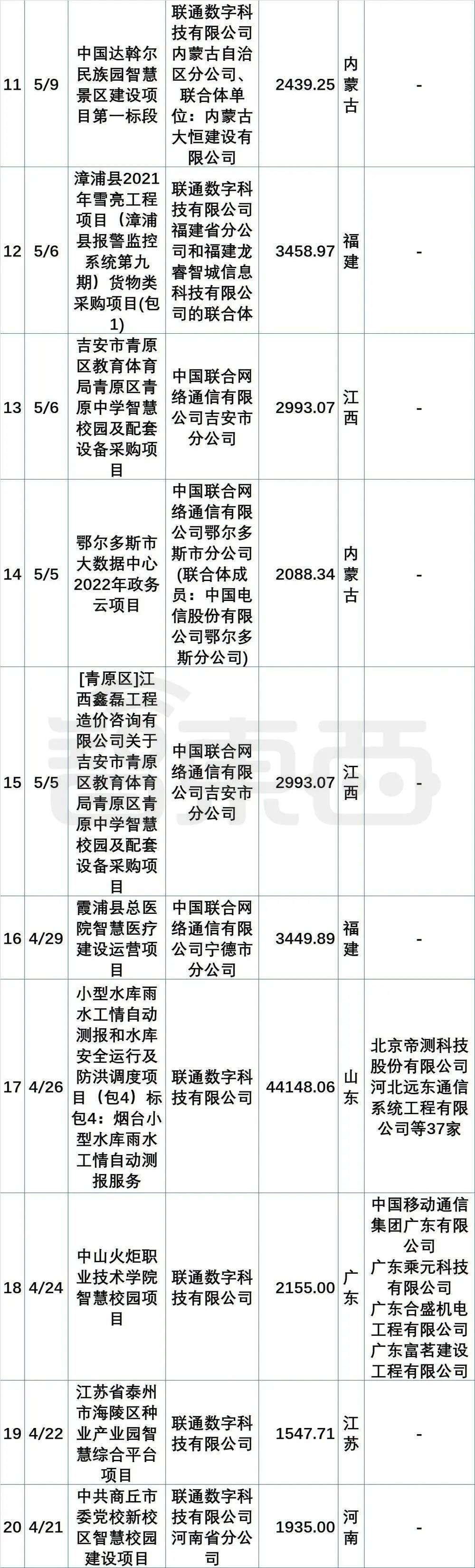 大部分情况下,三大运营商是竞争关系,有时也分别中标同一项目的不同标包。偶尔,三大运营商之间也有合作,比如鄂尔多斯市大数据中心2022年政务云项目。5月5日,中国联合网络通信有限公司鄂尔多斯市分公司与中国电信股份有限公司鄂尔多斯分公司联合体中标该项目,中标金额为2088.34万元。