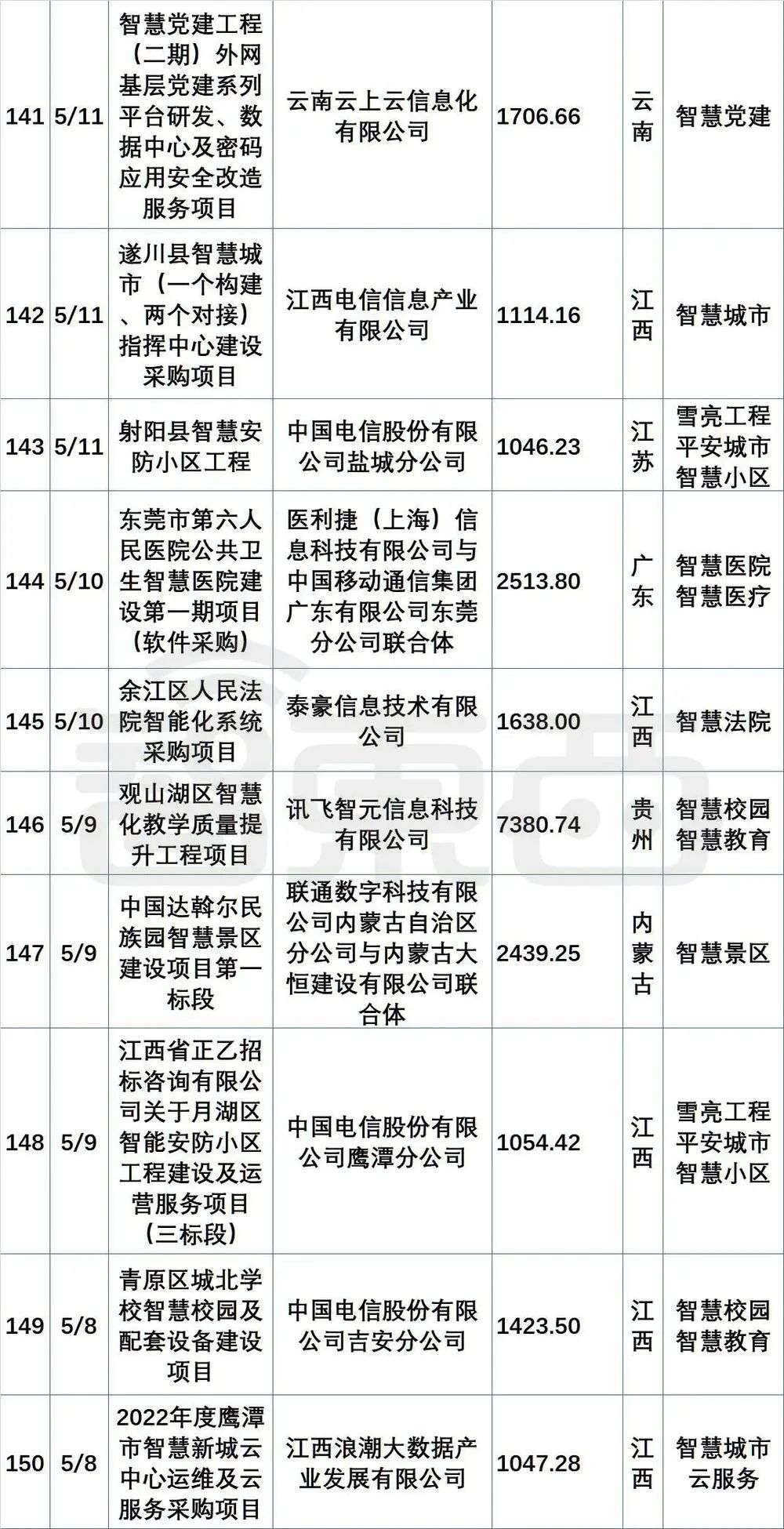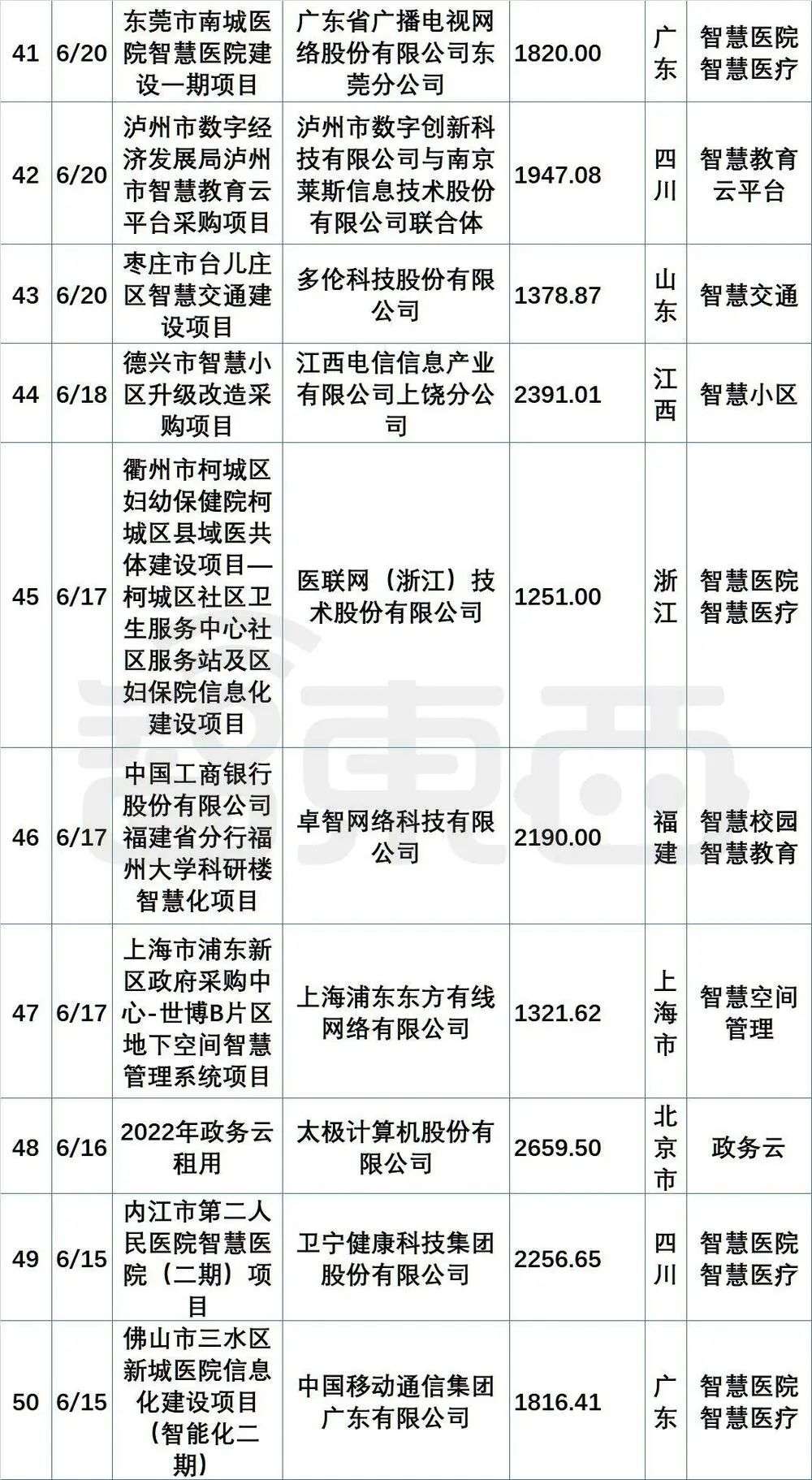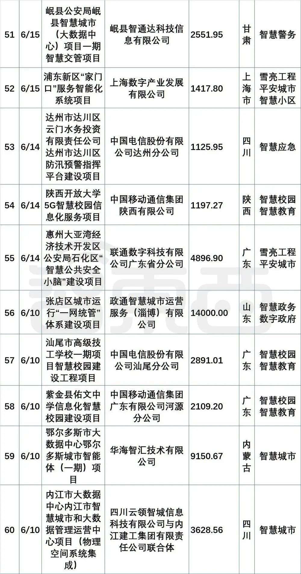 但从第一季度和第二季度的数百个千万级智慧城市项目的大单中,我们不难发现其实各地推进数智化转型的步伐还是相当迅速的,很多项目从招标到公布中标人选只用了一个多月的时间。其实,这与各地推进智慧城市、数字政府等数智化转型建设密切相关,不少单位可能会利用云平台等方式线上进行项目开标评选,降低疫情影响,进一步推动城市智慧化建设、政务数字化建设。